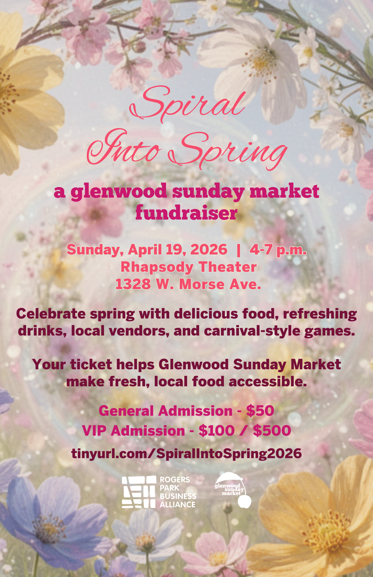 Spiral Into Spring – 2026 Celebrate spring, community, and fresh food at Spiral Into Spring, a festive evening supporting Glenwood Sunday Market’s mission to make nutritious, locally grown food accessible to all. Click image for more information.